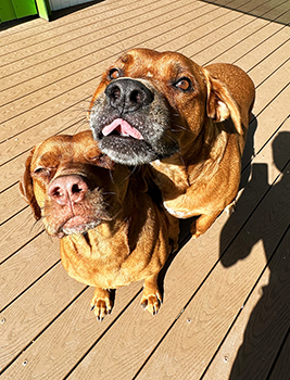 Sienna is a Vizsla mix around 40 pounds, about 1 1/2 years old. She is a timid little girl but very cuddly and playful when she gets comfortable. She and her brother love to take long walks in the neighborhood and parks. She is very food driven and enjoys bully sticks and treats. Still learning commands. She is not so great on a leash and needs some general training. She can be a little growly when other dogs growl at her but loves all people and children.